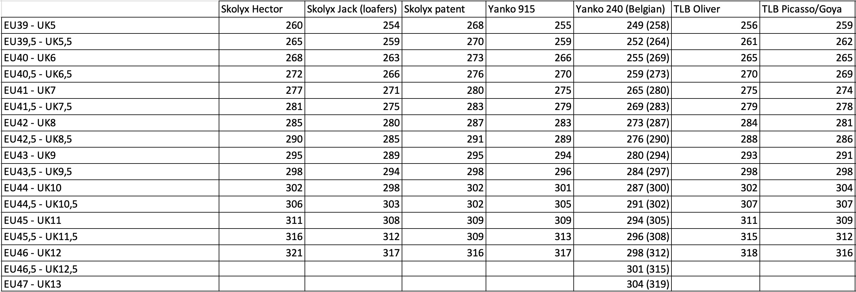 Bitte beachten Sie auch, dass unsere rahmengenähten Schuhe von Skolyx, Yanko und TLB alle in UK-Größen hergestellt werden, so dass die Schritte dort korrekt sind. Die Umrechnung in EU-Größen ist ungefähr, und für die USA folgen unsere Schuhe dem Standard mit einer Größe mehr im Vergleich zu UK.
